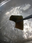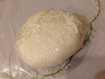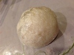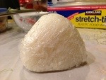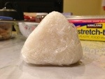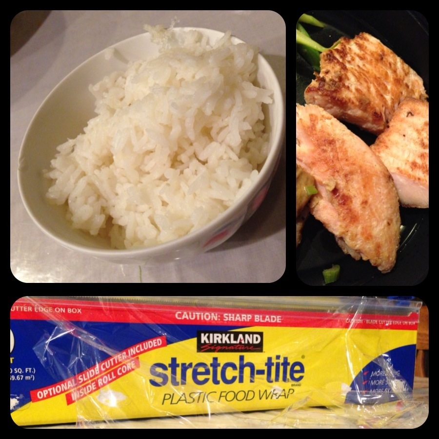 First, lay out the plastic wrap. Sprinkle some sea salt and water onto the wrap. Then deploy the rice~! Sushi rice is preferred, I think, but I ended up using the typical variety of steamed rice. Whatever is appropriately sticky and “pack-able” I suppose.